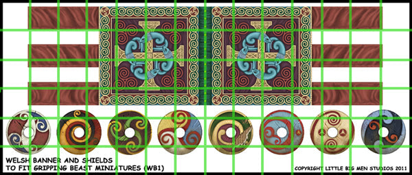 The shields are designed to fit Gripping Beast large round dark age shields but will also work on Foundry, crusader and Artizan round shields. The flag canbe used with any miniatures
