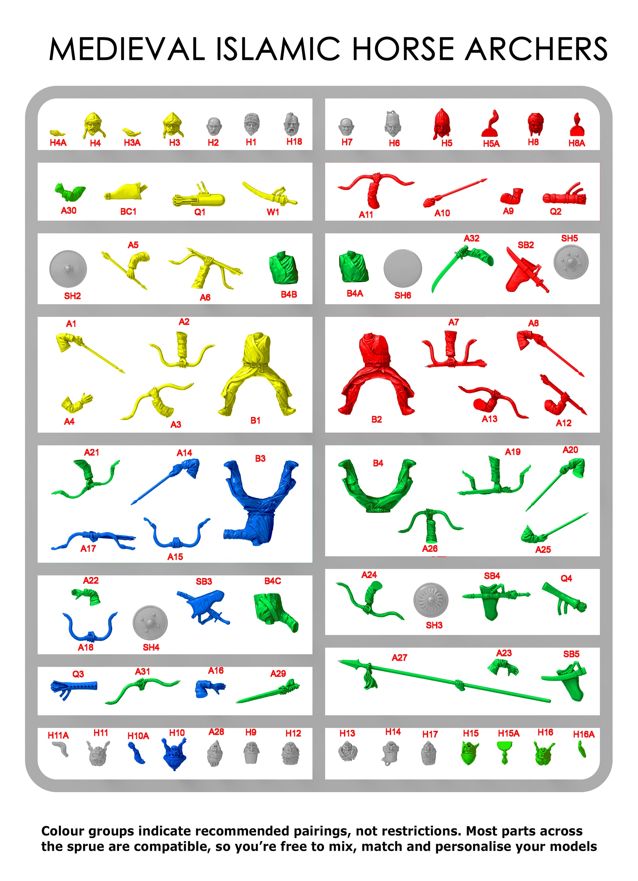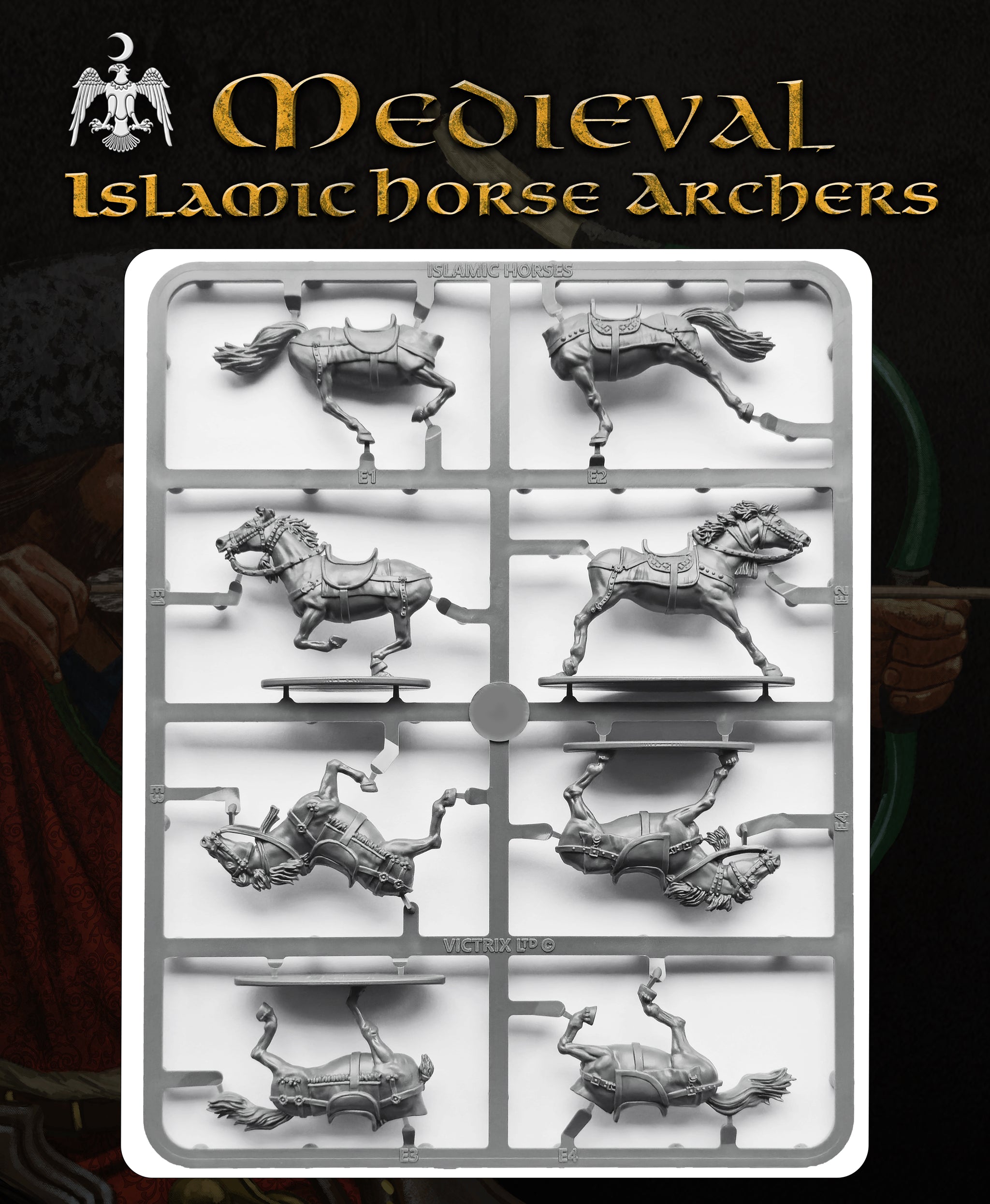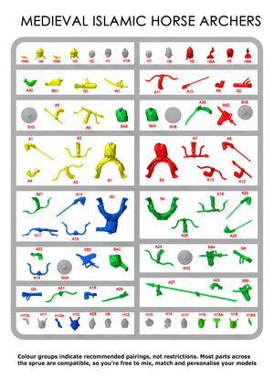 This plastic set depicts Seljuk and Turkoman horse archers, featuring a wide variety of head options that reflect the diverse warriors drawn from across the Islamic world. Turkoman tribes fought in vast numbers as auxiliaries within Seljuk and other Islamic forces, famed for their mastery of mounted archery and fluid battlefield tactics.