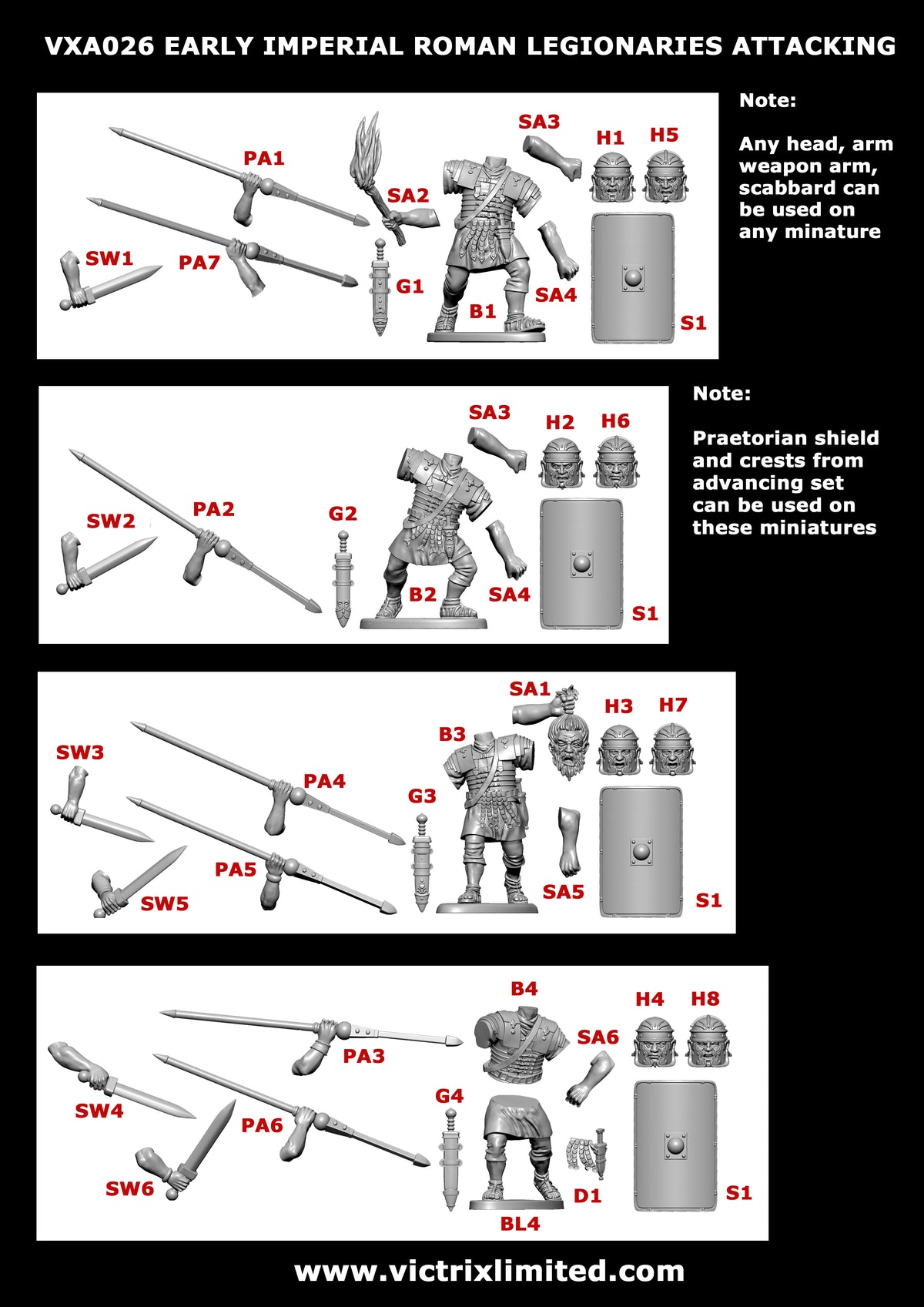 25 high quality 28mm miniatures. The Early Imperial Roman Legionaries Attacking are superbly detailed and include a myriad of additional parts, allowing for hundreds of options when assembling.