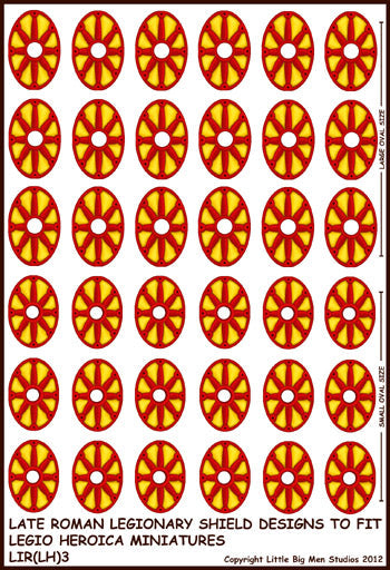 These transfers are designed to fit Legio Heroica's excellent range of Late Romans. Legio Heroica provide 2 sizes of Roman oval shield randomly in the packs. I have tried to cater for this by doing 2 sizes on the sheets. The larger and smaller versions so you are not having to buy separate sheets for the varying sizes. It is marked in brackets on the side of the sheet which designs fit the larger and smaller oval shields.