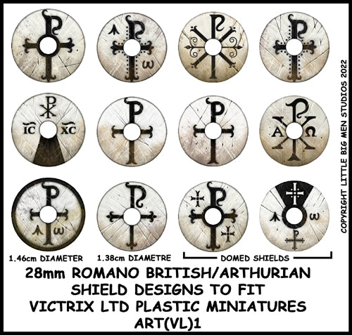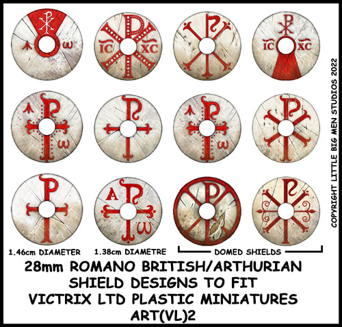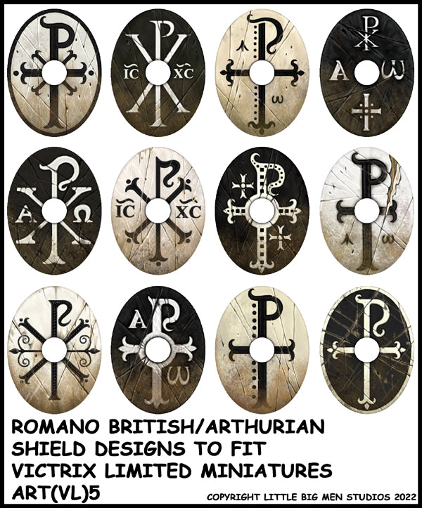 Estos diseños de escudo representan el símbolo de Christian Chi Rho y las influencias celtas con un puñado de romano tardío. Los romanos se retiraron de Gran Bretaña en el 5th Century DC, pero su influencia continuó con las tropas locales de la guarnición que quedaron atrás que eran una mezcla de británicos indígenas y colonos del imperio que no se fueron.
