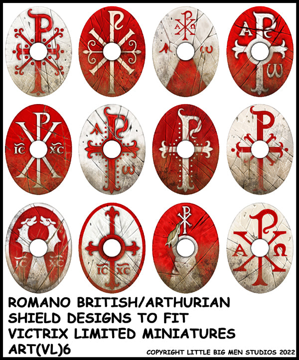 Estos diseños de escudo representan el símbolo de Christian Chi Rho y las influencias celtas con un puñado de romano tardío. Los romanos se retiraron de Gran Bretaña en el 5th Century DC, pero su influencia continuó con las tropas locales de la guarnición que quedaron atrás que eran una mezcla de británicos indígenas y colonos del imperio que no se fueron.