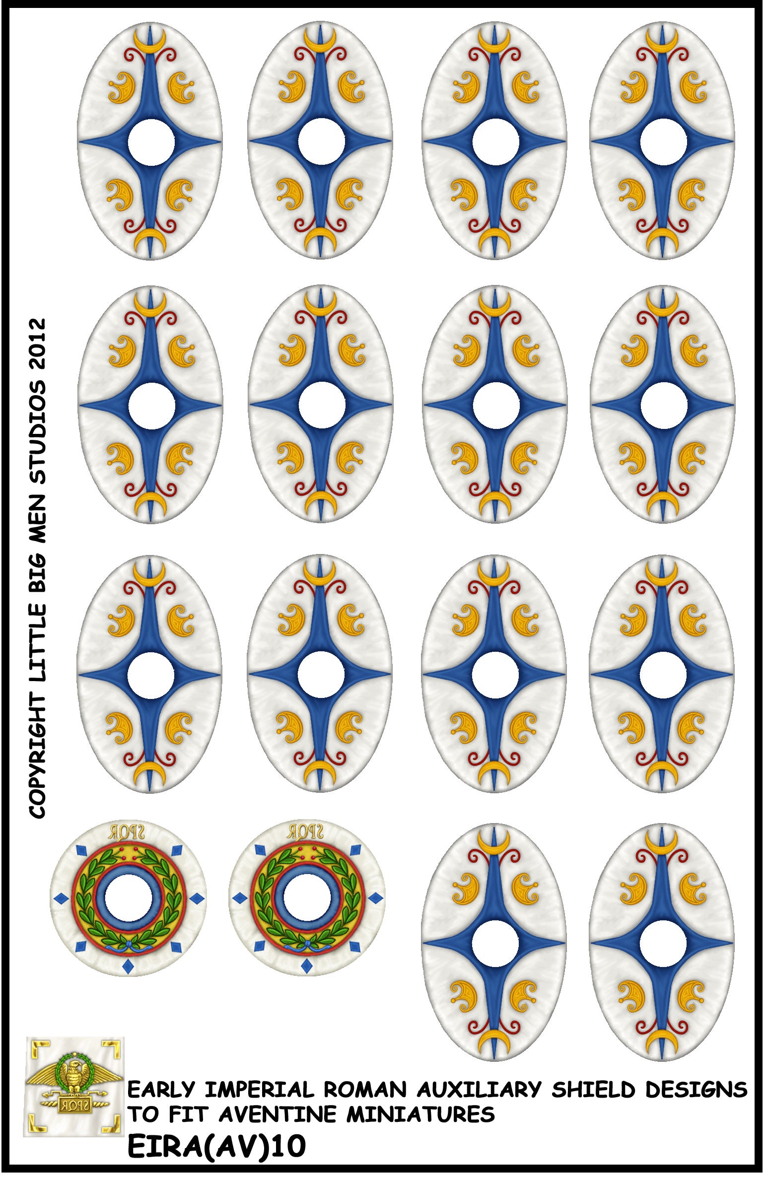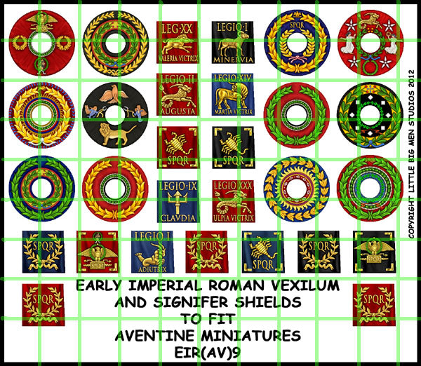 Early Imperial Roman Auxiliary transfer sheet to fit Aventine miniatures superb range of Romans. The transfers are for the shields, Standard bearer and musician bucklers and Vexilum. Ideally used with Avenines 16 figure unit packs.