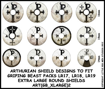 These transfers are to fit Gripping Beast extra large round shields, Specifically packs LR17, LR18 and LR19. These have a mix of shield sizes which are cast on the figures. The sizers vary from 14mm to 16,5 and 17mm. I have gone for an average of the sizes and done a 14mm, 15mm and 16mm diametre. All have the same shield boss size on the models thankfully which is 4mm.