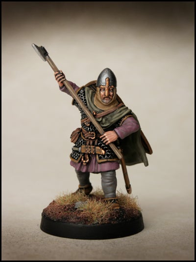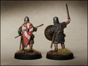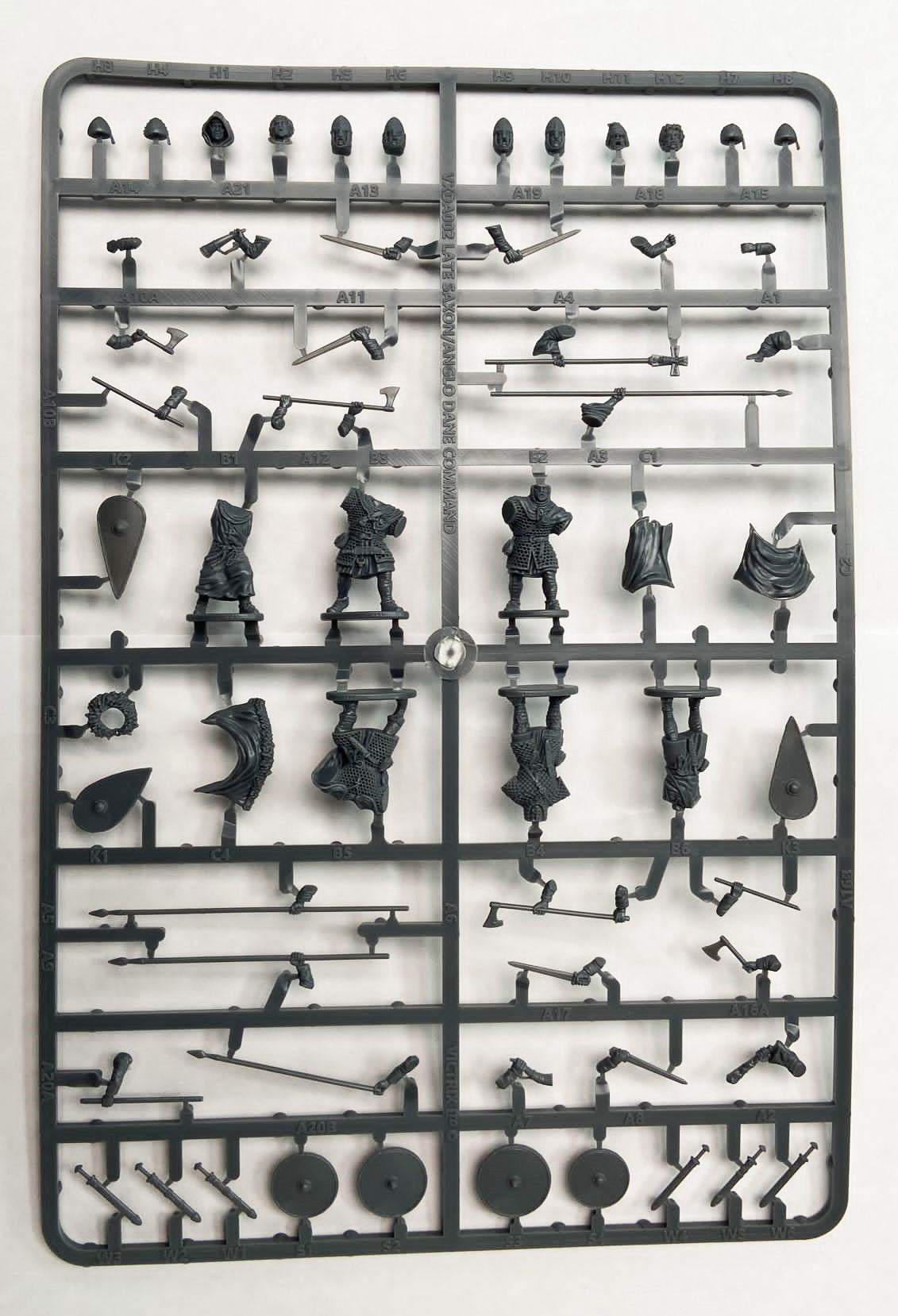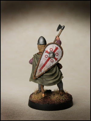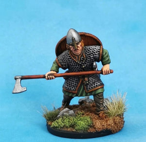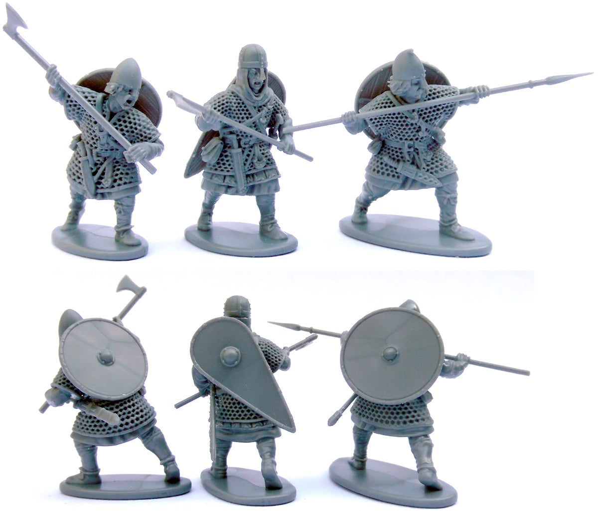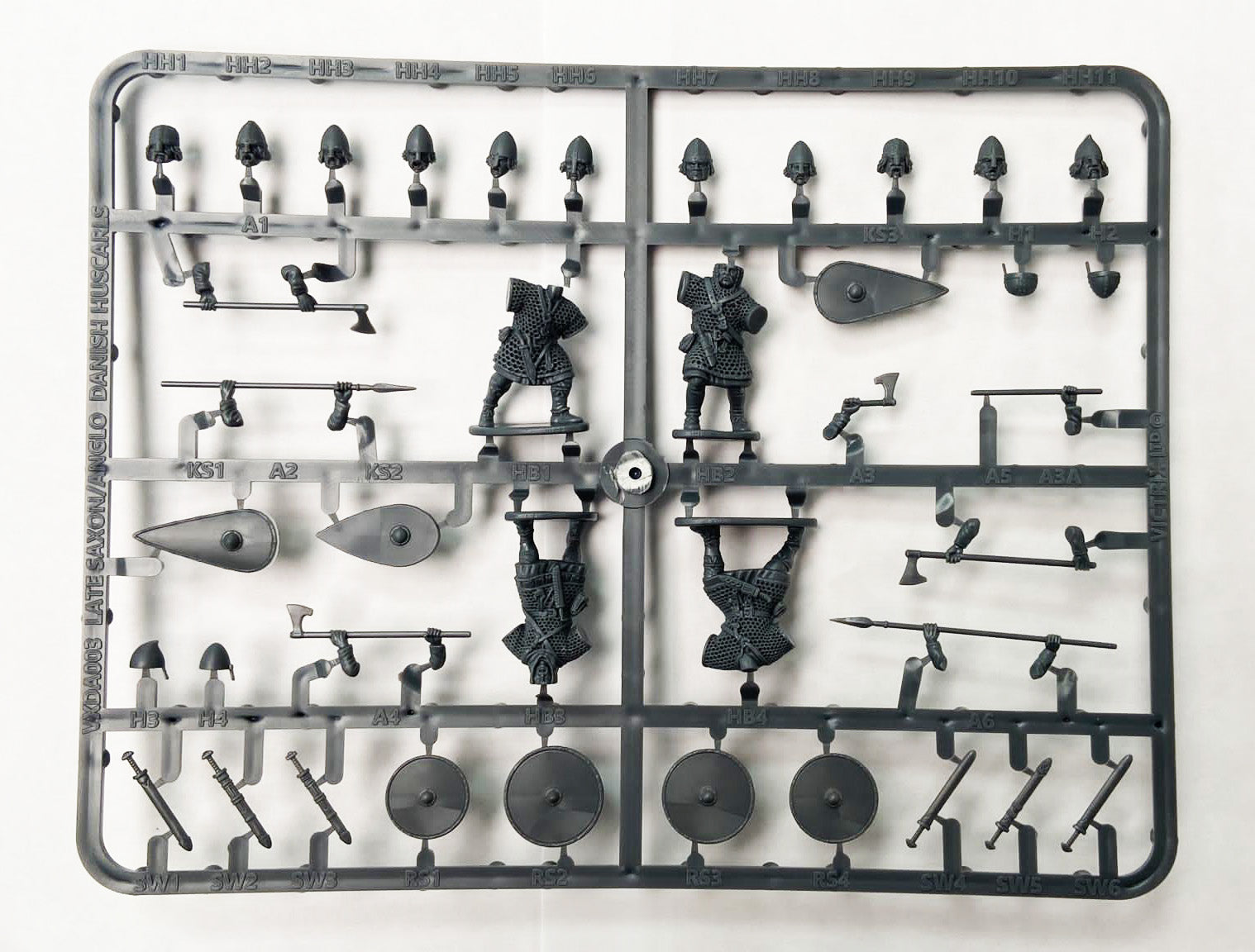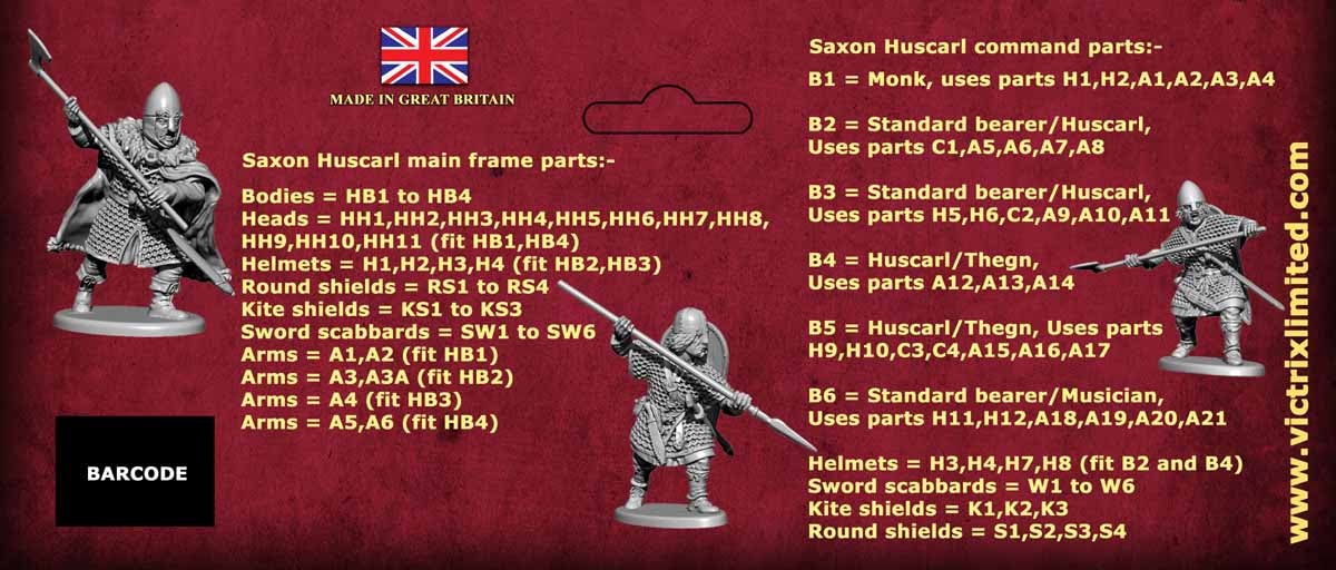 The Huscarls set represent the Saxon warrior elite. Equipped with chain mail, an assortment of helmets, they carry a double handed Dane Axe or can use a spear. You can also use some of the two handed axes on some of the body positions on the Saxon warriors frame thus increasing the amount of variety for your Huscarl figures.