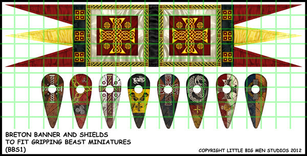 This is a banner and shield transfer sheet for Gripping Beast Breton figures for their Saga rules system. (can also be used with other nationalities and miniatures)