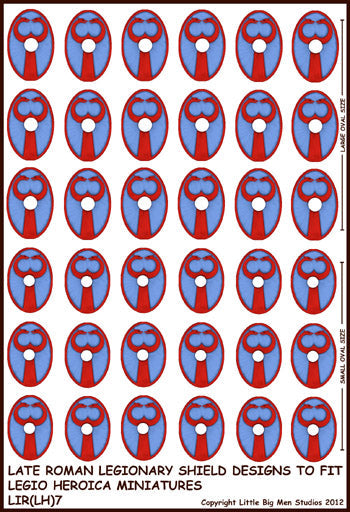 These transfers are designed to fit Legio Heroica's excellent range of Late Romans. Legio Heroica provide 2 sizes of Roman oval shield randomly in the packs. I have tried to cater for this by doing 2 sizes on the sheets. The larger and smaller versions so you are not having to buy separate sheets for the varying sizes. It is marked in brackets on the side of the sheet which designs fit the larger and smaller oval shields.