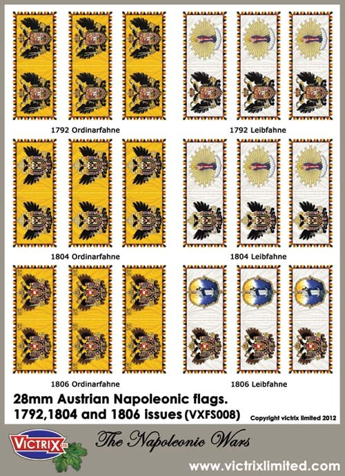 18 австрийских флаги OD 1792, 1804 и 1806 гг. Выпуск 1792 и 1804 года использовался в 1809 году и за его пределами. Полкаты, как правило, держались на своих флагах, пока они не изнули, и затем были заменены. Таким образом, смесь добавляет реальные разнообразие к вашим подразделениям.